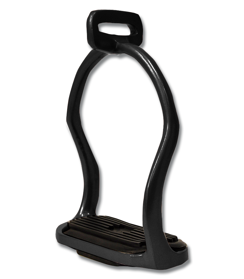 Gebogen scharen met oog voor stijgbeugelriem in een hoek van 90°. Zwarte zoolinzetstukken.