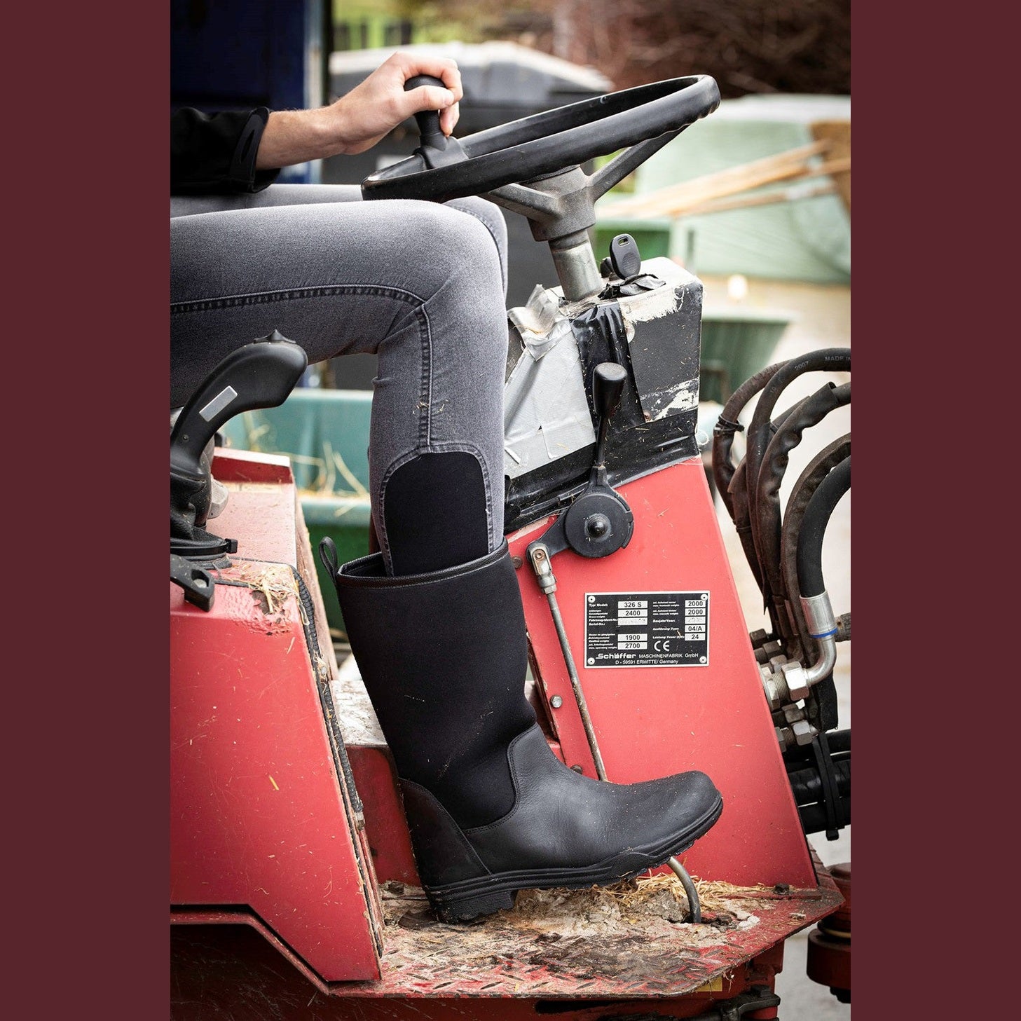 Waterdichte outdoorlaars. De voet van de laars is van leer en de schacht is van neopreen. De laars heeft een flexibele TPR-zool en de binnenkant is gevoerd met een waterdicht membraan.