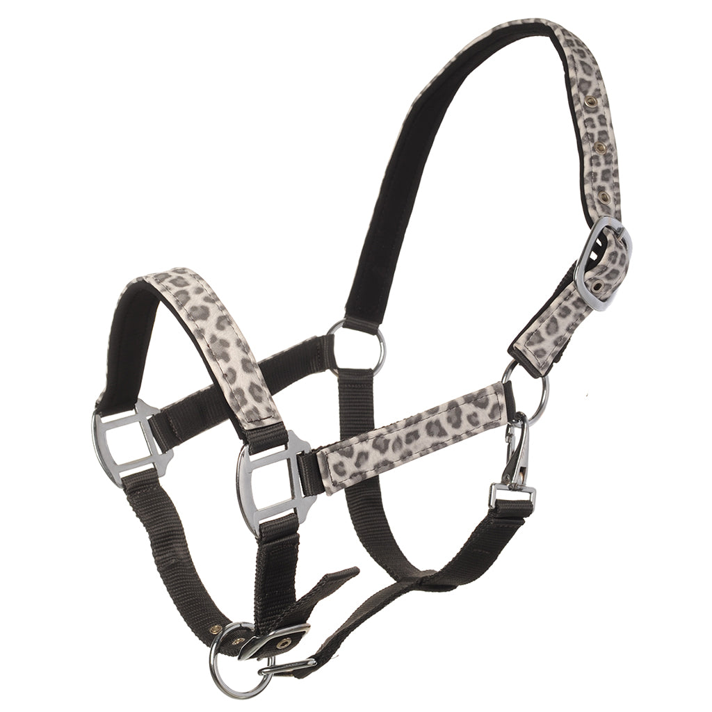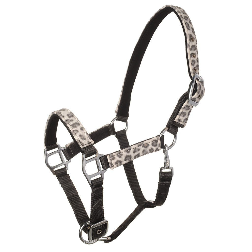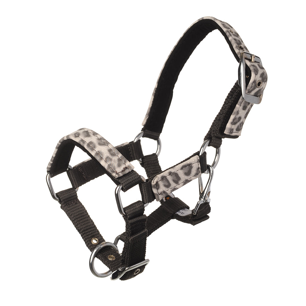 Ontzettend leuke halsters van de MHS lijn. Gemaakt van sterk nylon met leuke leopard print en zacht onderlegt op de neus en het kopstuk. Verstelbaar onder de kin, bij het kopstuk en met clip aan de keelriem.