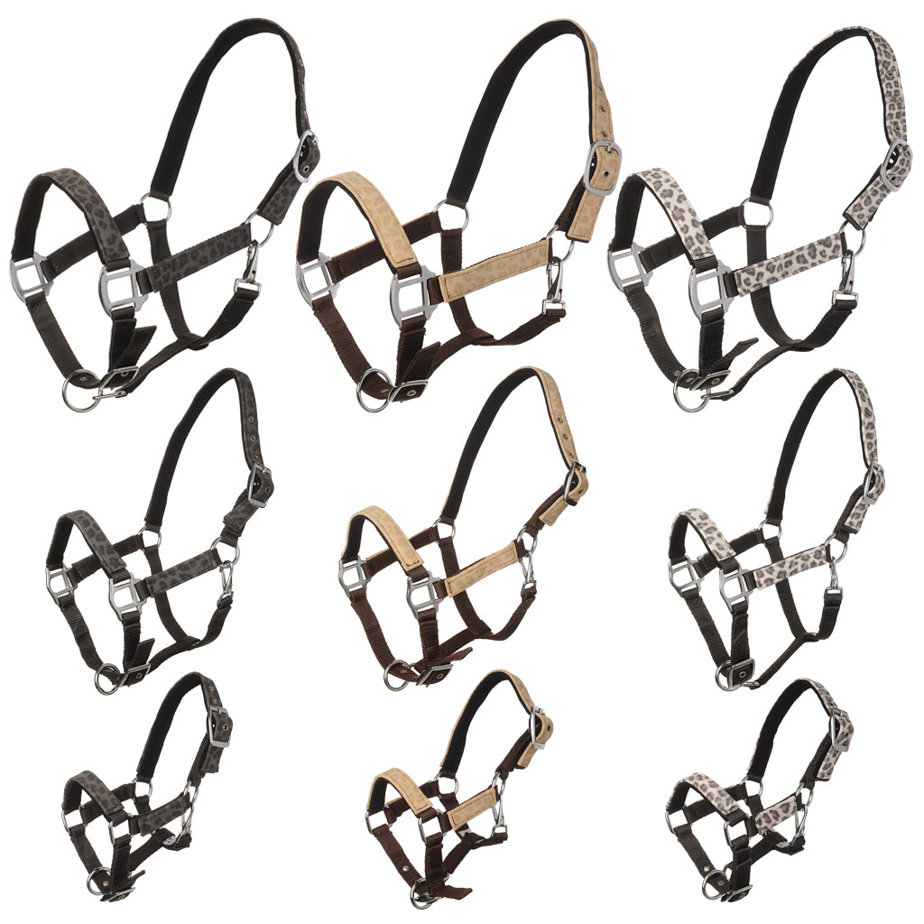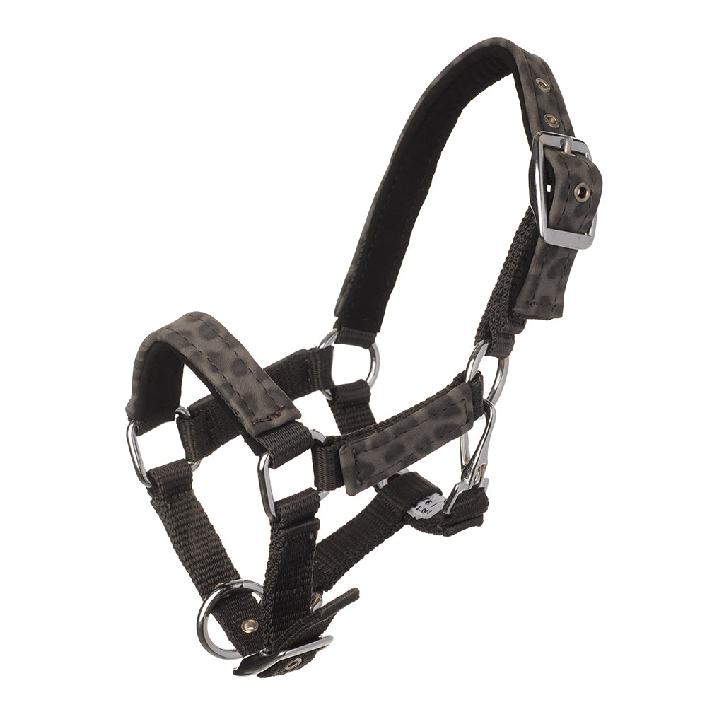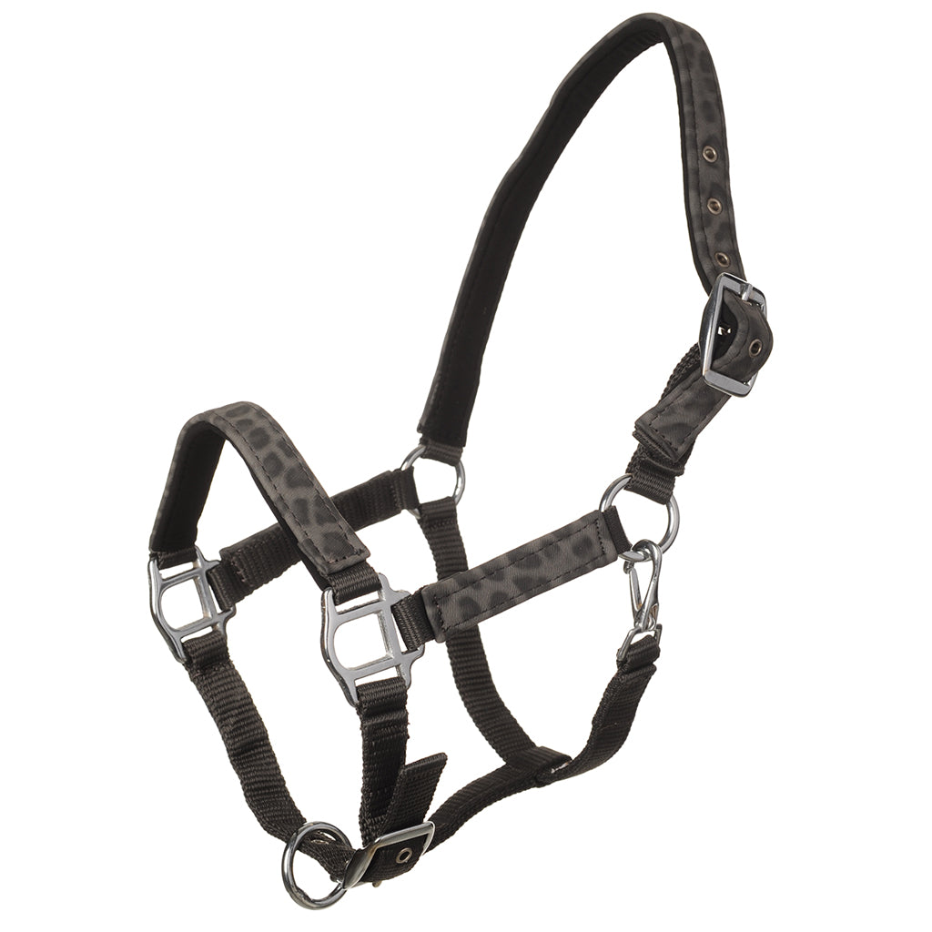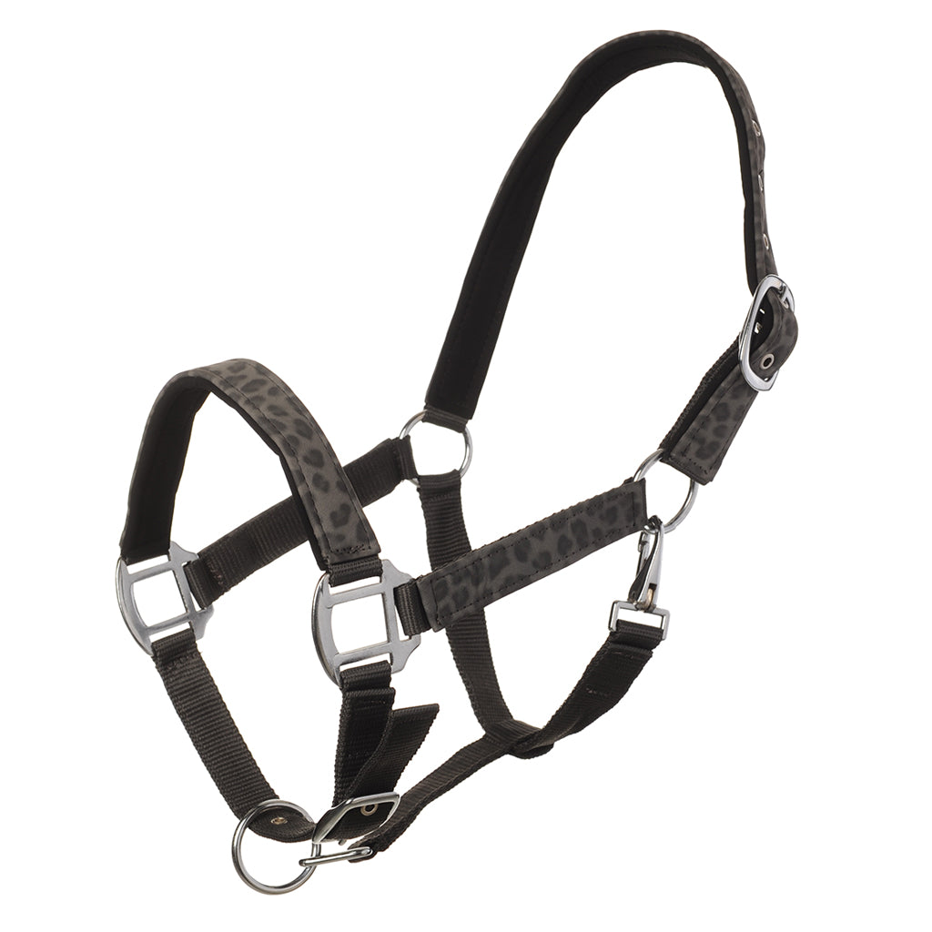 Ontzettend leuke halsters van de MHS lijn. Gemaakt van sterk nylon met leuke leopard print en zacht onderlegt op de neus en het kopstuk. Verstelbaar onder de kin, bij het kopstuk en met clip aan de keelriem.