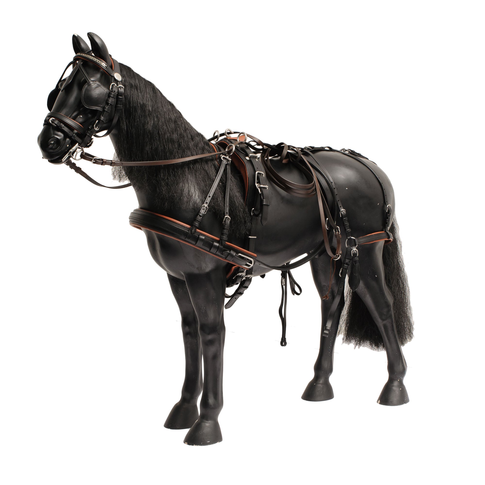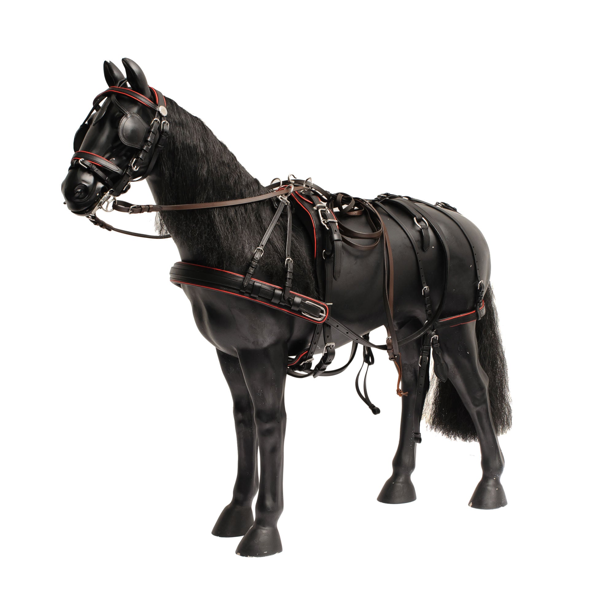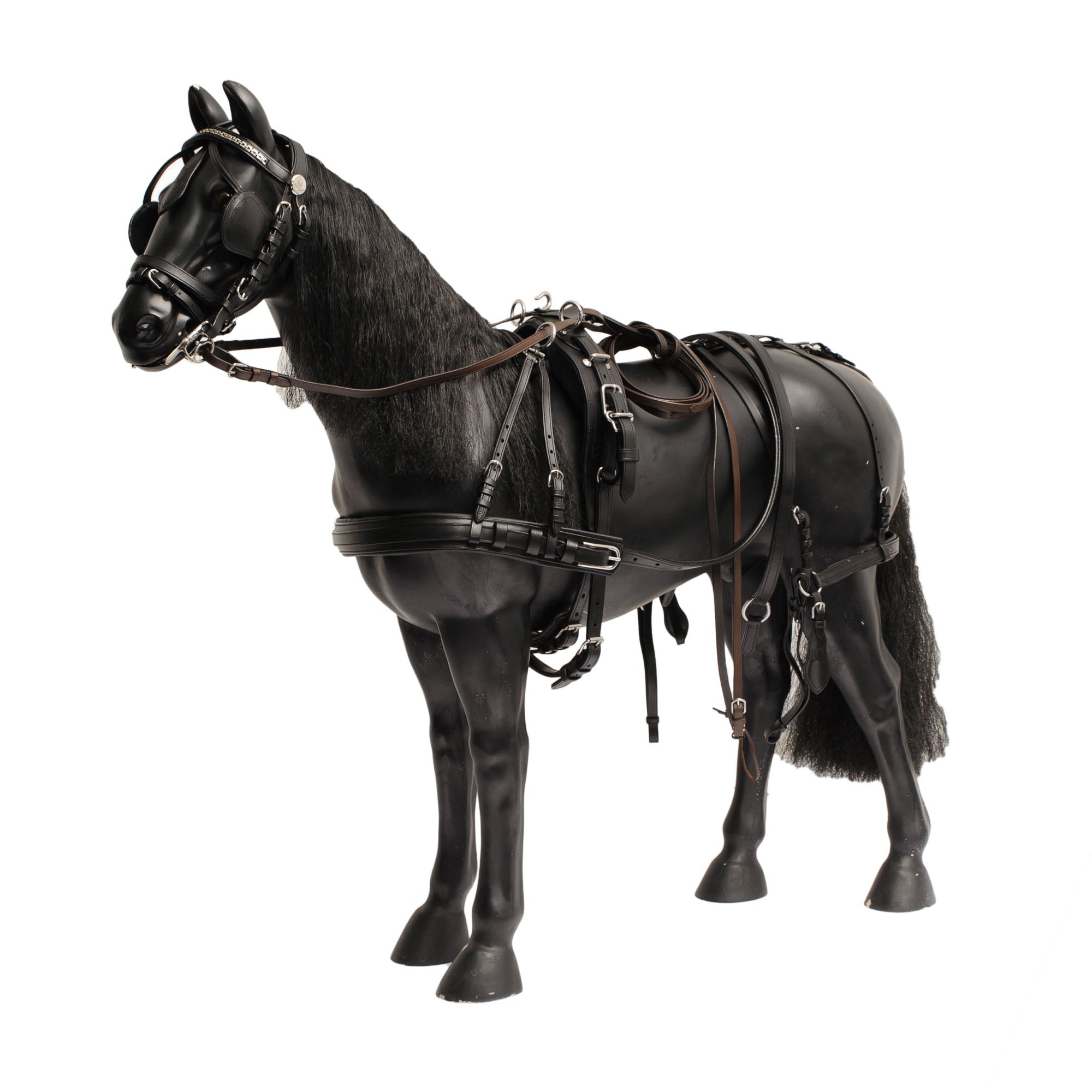 Dit tuig is gemaakt van hoogwaardig, soepel leder en het borststuk, schoftje en de broekriem zijn zacht onderlegd met goed gevulde kussens. Het hoofdstel heeft een verstelbare neusriem en een afneembare sperriem, waardoor het perfect op maat gemaakt kan worden voor jouw paard.