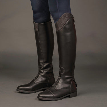Synthetische leren rijlaars met ritssluiting aan de achterzijde. De rits is boven en onder afgedekt met een flapje met een drukknoopsluiting. Aan de voorkant een elastische veter, een elastische inzet op de kuit voor een optimale aansluiting en een glitter versiering naast de knie.