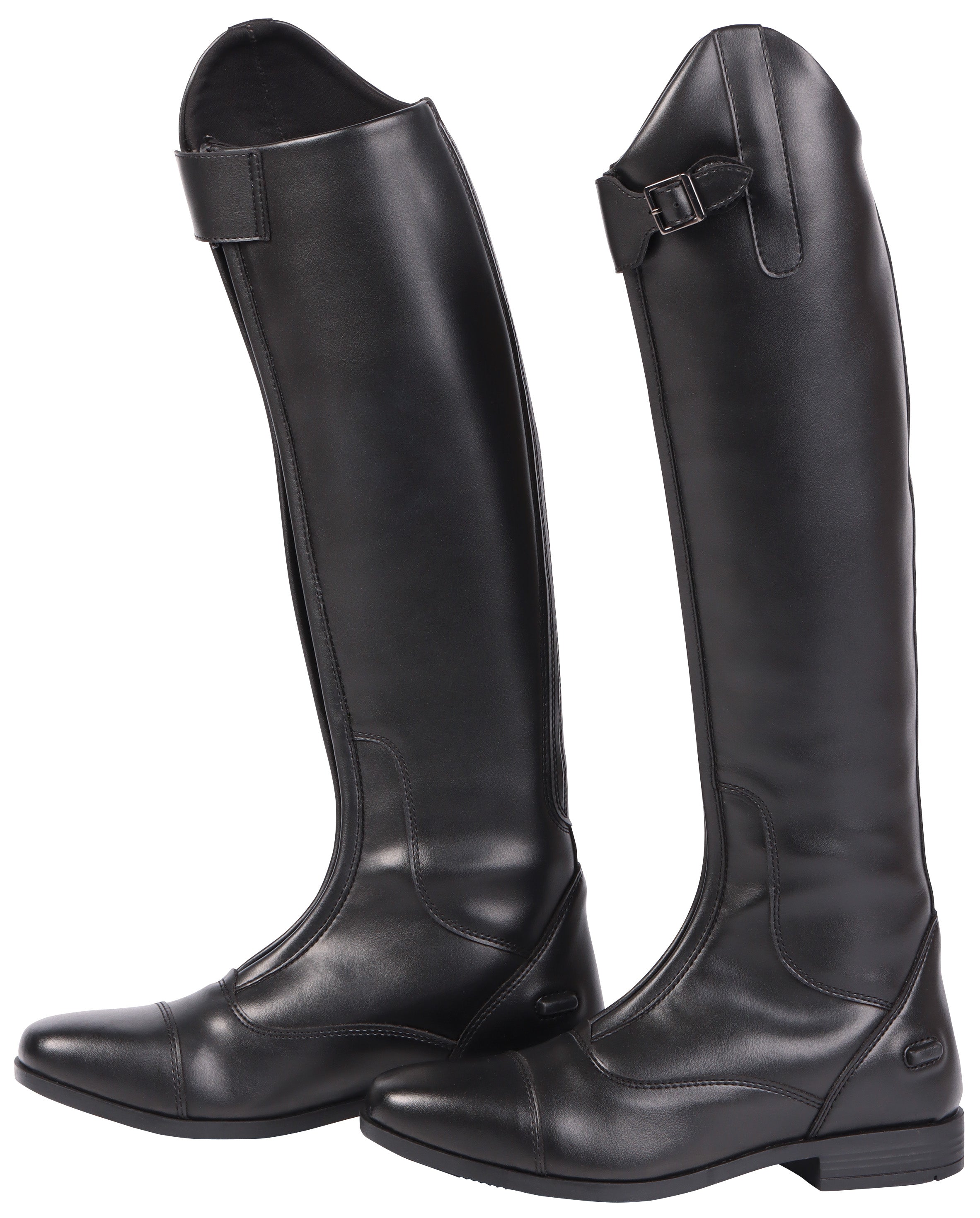 Synthetisch lederen rijlaars met rits aan de voorzijde inclusief beschermflap die eenvoudig te openen en te sluiten is. Met elastische inzet aan de achterzijde.