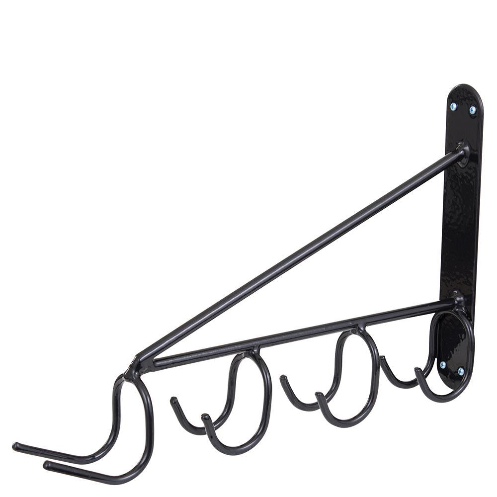 Ruimtebesparende gereedschaphouder voor vier stuks gereedschap. De drie achterste haken zijn geschikt voor schoppen, harken, bezems en dergelijke, terwijl op de grotere voorste haak ook een bezem op zijn kop kan hangen.